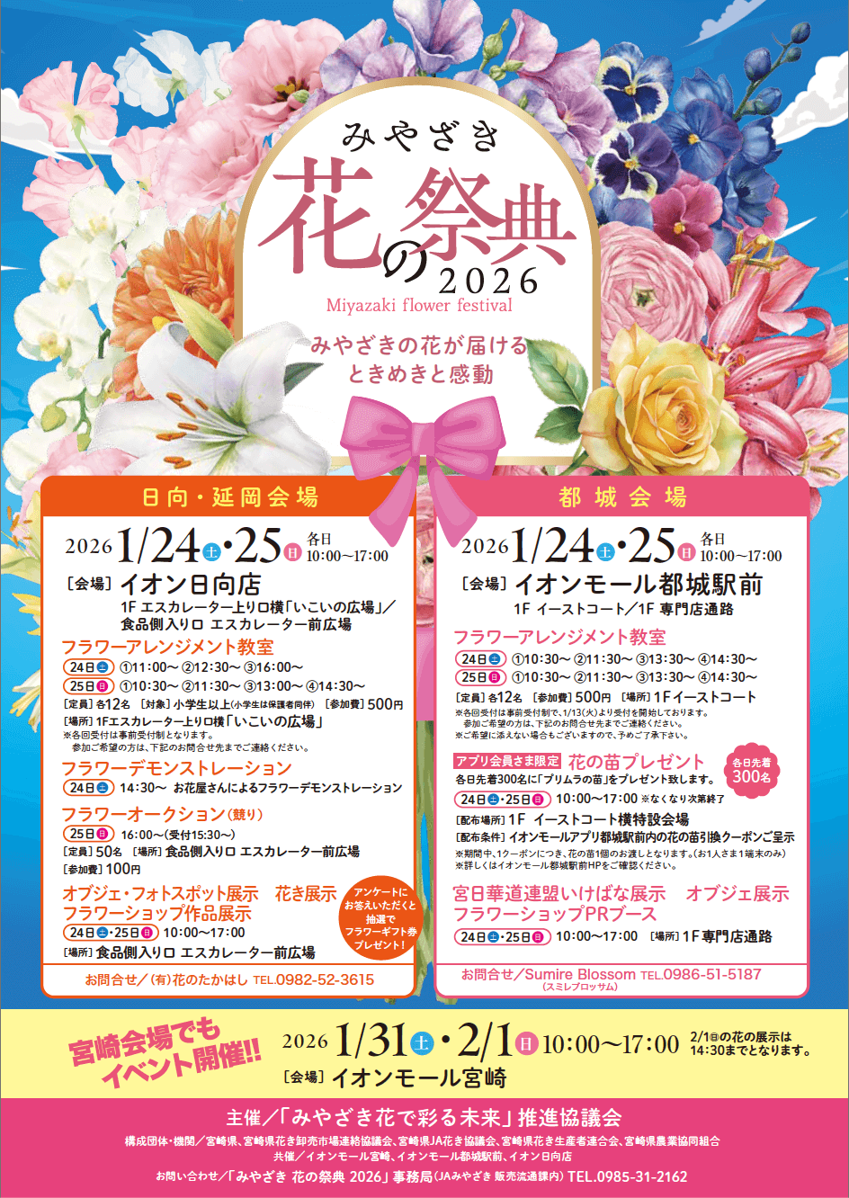 お知らせ 2026/01/19 「みやざき花の祭典2026」を開催します!(日向・延岡会場&都城会場)2026年1月24日(土)、25日(日)に日向・延岡会場の「イオン日向店」と都城会場の「イオンモール都城駅前」にて みやざき花の祭典2026が開催されます! イベントの詳細は下記のチラシよりご確認ください♪ 新着一覧にもどる